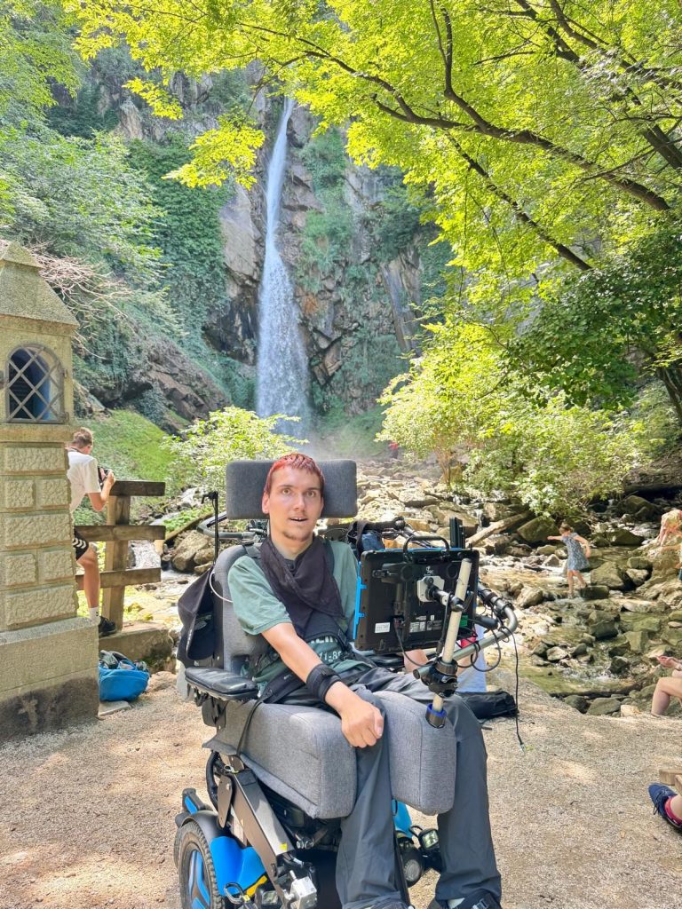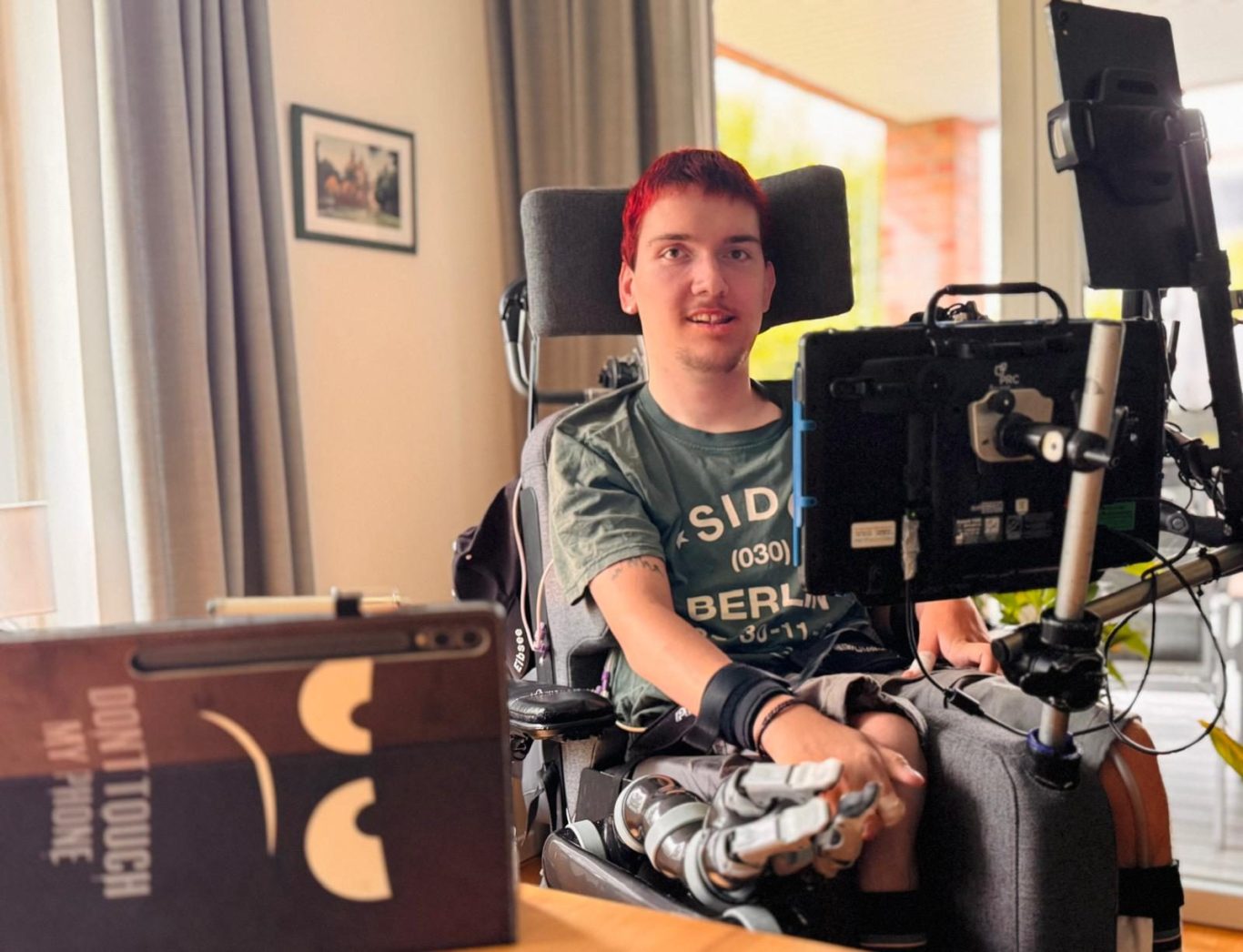 Da ich aufgrund meiner Infantilen Cerebralparese nicht mit meinem Mund sprechen kann, habe ich einen Sprachcomputer, mit dem kann ich alles sagen was ich möchte. Ich kann sogar meinen Elektrorollstuhl und den Roboterarm über den Sprachcomputer mit der Augensteuerung bewegen. Das klappt super.